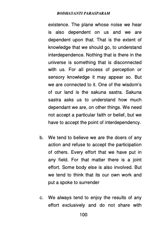 existence. The plane whose noise we hear is also dependent on us and we are dependent upon that. That is the extent of knowledge that we should go, to understand interdependence. Nothing that is there in the universe is something that is disconnected with us. For all process of perception or sensory knowledge it may appear so. But we are connected to it. One of the wisdom’s of our land is the sakuna sastra. Sakuna sastra asks us to understand how much dependant we are, on other things. We need not accept a particular faith or belief, but we have to accept the point of interdependency.