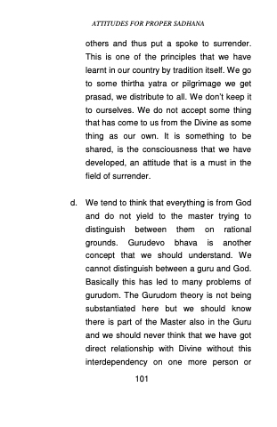 d. We tend to think that everything is from God and do not yield to the master trying to distinguish between them on rational grounds. Gurudevo bhava is another concept that we should understand. We cannot distinguish between a guru and God. Basically this has led to many problems of gurudom. The Gurudom theory is not being substantiated here but we should know there is part of the Master also in the Guru and we should never think that we have got direct relationship with Divine without this interdependency on one more person or