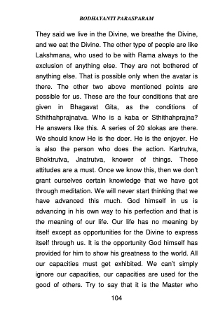 They said we live in the Divine, we breathe the Divine, and we eat the Divine. The other type of people are like Lakshmana, who used to be with Rama always to the exclusion of anything else. They are not bothered of anything else. That is possible only when the avatar is there. The other two above mentioned points are possible for us. These are the four conditions that are given in Bhagavat Gita, as the conditions of Sthithahprajnatva. Who is a kaba or Sthithahprajna? He answers like this. A series of 20 slokas are there. We should know He is the doer. He is the enjoyer. He is also the person who does the action. Kartrutva, Bhoktrutva, Jnatrutva, knower of things. These attitudes are a must. Once we know this, then we don’t grant ourselves certain knowledge that we have got through meditation. We will never start thinking that we have advanced this much. God himself in us is advancing in his own way to his perfection and that is the meaning of our life. Our life has no meaning by itself except as opportunities for the Divine to express itself through us. It is the opportunity God himself has provided for him to show his greatness to the world. All our capacities must get exhibited. We can’t simply ignore our capacities, our capacities are used for the good of others. Try to say that it is the Master who