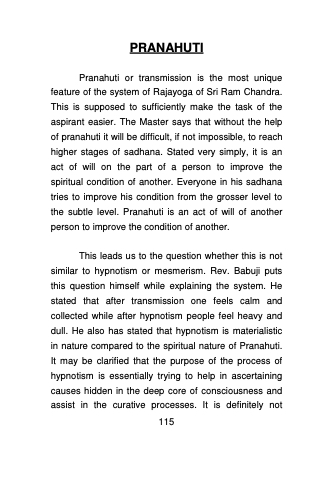 This leads us to the question whether this is not similar to hypnotism or mesmerism. Rev. Babuji puts this question himself while explaining the system. He stated that after transmission one feels calm and collected while after hypnotism people feel heavy and dull. He also has stated that hypnotism is materialistic in nature compared to the spiritual nature of Pranahuti. It may be clarified that the purpose of the process of hypnotism is essentially trying to help in ascertaining causes hidden in the deep core of consciousness and assist in the curative processes. It is definitely not