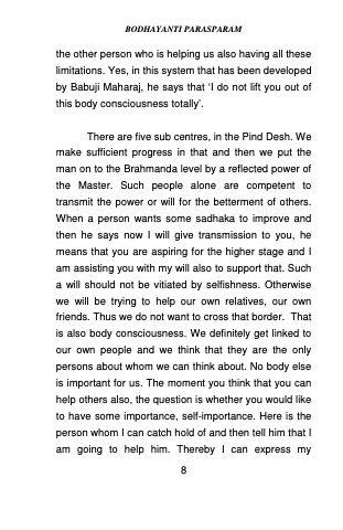 There are five sub centres, in the Pind Desh. We make sufficient progress in that and then we put the man on to the Brahmanda level by a reflected power of the Master. Such people alone are competent to transmit the power or will for the betterment of others. When a person wants some sadhaka to improve and then he says now I will give transmission to you, he means that you are aspiring for the higher stage and I am assisting you with my will also to support that. Such a will should not be vitiated by selfishness. Otherwise we will be trying to help our own relatives, our own friends. Thus we do not want to cross that border. That is also body consciousness. We definitely get linked to our own people and we think that they are the only persons about whom we can think about. No body else is important for us. The moment you think that you can help others also, the question is whether you would like to have some importance, self-importance. Here is the person whom I can catch hold of and then tell him that I am going to help him. Thereby I can express my