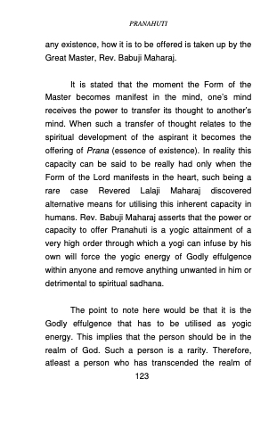 It is stated that the moment the Form of the Master becomes manifest in the mind, one’s mind receives the power to transfer its thought to another’s mind. When such a transfer of thought relates to the spiritual development of the aspirant it becomes the offering of Prana (essence of existence). In reality this capacity can be said to be really had only when the Form of the Lord manifests in the heart, such being a rare case Revered Lalaji Maharaj discovered alternative means for utilising this inherent capacity in humans. Rev. Babuji Maharaj asserts that the power or capacity to offer Pranahuti is a yogic attainment of a very high order through which a yogi can infuse by his own will force the yogic energy of Godly effulgence within anyone and remove anything unwanted in him or detrimental to spiritual sadhana.