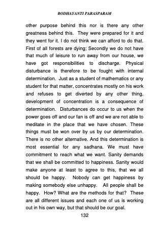 other purpose behind this nor is there any other greatness behind this. They were prepared for it and they went for it. I do not think we can afford to do that. First of all forests are dying; Secondly we do not have that much of leisure to run away from our house, we have got responsibilities to discharge. Physical disturbance is therefore to be fought with internal determination. Just as a student of mathematics or any student for that matter, concentrates mostly on his work and refuses to get diverted by any other thing, development of concentration is a consequence of determination. Disturbances do occur to us when the power goes off and our fan is off and we are not able to meditate in the place that we have chosen. These things must be won over by us by our determination. There is no other alternative. And this determination is most essential for any sadhana. We must have commitment to reach what we want. Sanity demands that we shall be committed to happiness. Sanity would make anyone at least to agree to this, that we all should be happy. Nobody can get happiness by making somebody else unhappy. All people shall be happy. How? What are the methods for that? These are all different issues and each one of us is working out in his own way, but that should be our goal.