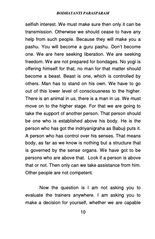 selfish interest. We must make sure then only it can be transmission. Otherwise we should cease to have any help from such people. Because they will make you a pashu. You will become a guru pashu. Don’t become one. We are here seeking liberation. We are seeking freedom. We are not prepared for bondages. No yogi is offering himself for that, no man for that matter should become a beast. Beast is one, which is controlled by others. Man has to stand on his own. We have to go out of this lower level of consciousness to the higher. There is an animal in us, there is a man in us. We must move on to the higher stage. For that we are going to take the support of another person. That person should be one who is established above his body. He is the person who has got the indriyanigraha as Babuji puts it. A person who has control over his senses. That means body, as far as we know is nothing but a structure that is governed by the sense organs. We have got to be persons who are above that. Look if a person is above that or not. Then only can we take assistance from him. Other people are not competent.