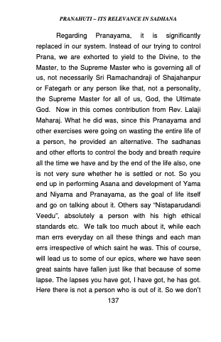 Regarding Pranayama, it is significantly replaced in our system. Instead of our trying to control Prana, we are exhorted to yield to the Divine, to the Master, to the Supreme Master who is governing all of us, not necessarily Sri Ramachandraji of Shajahanpur or Fategarh or any person like that, not a personality, the Supreme Master for all of us, God, the Ultimate God. Now in this comes contribution from Rev. Lalaji Maharaj. What he did was, since this Pranayama and other exercises were going on wasting the entire life of a person, he provided an alternative. The sadhanas and other efforts to control the body and breath require all the time we have and by the end of the life also, one is not very sure whether he is settled or not. So you end up in performing Asana and development of Yama and Niyama and Pranayama, as the goal of life itself and go on talking about it. Others say “Nistaparudandi Veedu”, absolutely a person with his high ethical standards etc. We talk too much about it, while each man errs everyday on all these things and each man errs irrespective of which saint he was. This of course, will lead us to some of our epics, where we have seen great saints have fallen just like that because of some lapse. The lapses you have got, I have got, he has got. Here there is not a person who is out of it. So we don’t