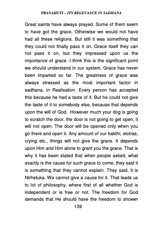 Great saints have always prayed. Some of them seem to have got the grace. Otherwise we would not have had all these religions. But still it was something that they could not finally pass it on. Grace itself they can not pass it on, but they impressed upon us the importance of grace. I think this is the significant point we should understand in our system. Grace has never been imparted so far. The greatness of grace was always stressed as the most important factor in sadhana, in Realisation. Every person has accepted this because he had a taste of it. But he could not give the taste of it to somebody else, because that depends upon the will of God. However much your dog is going to scratch the door, the door is not going to get open, it will not open. The door will be opened only when you go there and open it. Any amount of our bakthi, stotras, crying etc., things will not give the grace. It depends upon Him and Him alone to grant you the grace. That is why it has been stated that when people asked, what exactly is the cause for such grace to come, they said it is something that they cannot explain. They said, it is Nirhetuka. We cannot give a cause for it. That leads us to lot of philosophy, where first of all whether God is independent or is free or not. The freedom for God demands that He should have the freedom to shower