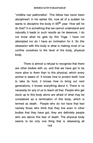 “vriddha nari pathivratha”. This fellow has never been disciplined1 in his earlier life, now all of a sudden he wants to discipline the body in 65th year. How will he do that? It is something that we cannot understand and naturally it leads to such results as he deserves. I do not know what he gets by this Yoga. I have not attempted nor do I have an inclination for it. So this obsession with this body is what is making most of us confine ourselves to the level of the body, physical body.