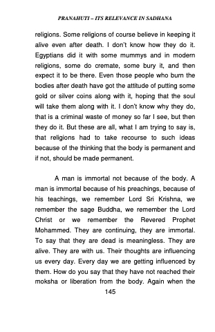 religions. Some religions of course believe in keeping it alive even after death. I don’t know how they do it. Egyptians did it with some mummys and in modern religions, some do cremate, some bury it, and then expect it to be there. Even those people who burn the bodies after death have got the attitude of putting some gold or silver coins along with it, hoping that the soul will take them along with it. I don’t know why they do, that is a criminal waste of money so far I see, but then they do it. But these are all, what I am trying to say is, that religions had to take recourse to such ideas because of the thinking that the body is permanent and if not, should be made permanent.