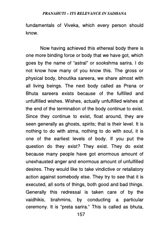 Now having achieved this ethereal body there is one more binding force or body that we have got, which goes by the name of “astral” or sookshma sarira. I do not know how many of you know this. The gross or physical body, bhoutika sareera, we share almost with all living beings. The next body called as Prana or Bhuta sareera exists because of the fulfilled and unfulfilled wishes. Wishes, actually unfulfilled wishes at the end of the termination of the body continue to exist. Since they continue to exist, float around, they are seen generally as ghosts, spirits; that is their level. It is nothing to do with atma, nothing to do with soul, it is one of the earliest levels of body. If you put the question do they exist? They exist. They do exist because many people have got enormous amount of unexhausted anger and enormous amount of unfulfilled desires. They would like to take vindictive or retaliatory action against somebody else. They try to see that it is executed, all sorts of things, both good and bad things. Generally this redressal is taken care of by the vaidhikis, brahmins, by conducting a particular ceremony. It is “preta sarira.” This is called as bhuta,
