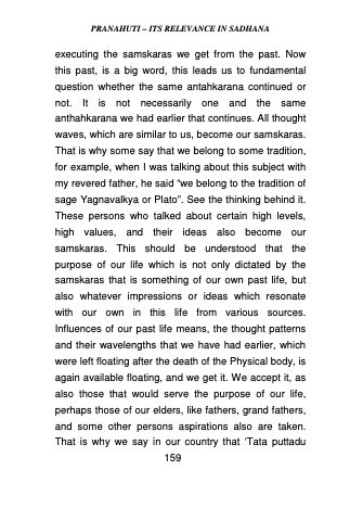 executing the samskaras we get from the past. Now this past, is a big word, this leads us to fundamental question whether the same antahkarana continued or not. It is not necessarily one and the same anthahkarana we had earlier that continues. All thought waves, which are similar to us, become our samskaras. That is why some say that we belong to some tradition, for example, when I was talking about this subject with my revered father, he said “we belong to the tradition of sage Yagnavalkya or Plato”. See the thinking behind it. These persons who talked about certain high levels, high values, and their ideas also become our samskaras. This should be understood that the purpose of our life which is not only dictated by the samskaras that is something of our own past life, but also whatever impressions or ideas which resonate with our own in this life from various sources. Influences of our past life means, the thought patterns and their wavelengths that we have had earlier, which were left floating after the death of the Physical body, is again available floating, and we get it. We accept it, as also those that would serve the purpose of our life, perhaps those of our elders, like fathers, grand fathers, and some other persons aspirations also are taken. That is why we say in our country that ‘Tata puttadu