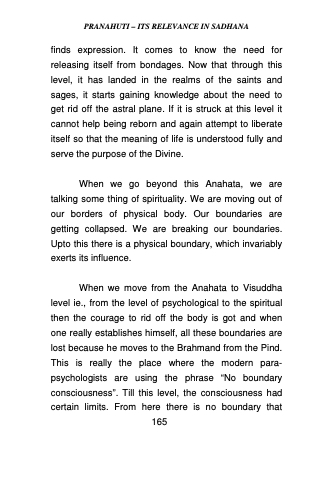 When we move from the Anahata to Visuddha level ie., from the level of psychological to the spiritual then the courage to rid off the body is got and when one really establishes himself, all these boundaries are lost because he moves to the Brahmand from the Pind. This is really the place where the modern para- psychologists are using the phrase “No boundary consciousness”. Till this level, the consciousness had certain limits. From here there is no boundary that