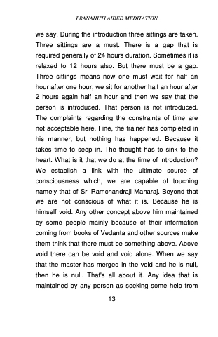 we say. During the introduction three sittings are taken. Three sittings are a must. There is a gap that is required generally of 24 hours duration. Sometimes it is relaxed to 12 hours also. But there must be a gap. Three sittings means now one must wait for half an hour after one hour, we sit for another half an hour after 2 hours again half an hour and then we say that the person is introduced. That person is not introduced. The complaints regarding the constraints of time are not acceptable here. Fine, the trainer has completed in his manner, but nothing has happened. Because it takes time to seep in. The thought has to sink to the heart. What is it that we do at the time of introduction? We establish a link with the ultimate source of consciousness which, we are capable of touching namely that of Sri Ramchandraji Maharaj. Beyond that we are not conscious of what it is. Because he is himself void. Any other concept above him maintained by some people mainly because of their information coming from books of Vedanta and other sources make them think that there must be something above. Above void there can be void and void alone. When we say that the master has merged in the void and he is null, then he is null. That's all about it. Any idea that is maintained by any person as seeking some help from