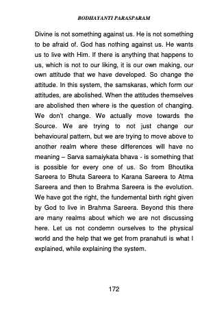 Divine is not something against us. He is not something to be afraid of. God has nothing against us. He wants us to live with Him. If there is anything that happens to us, which is not to our liking, it is our own making, our own attitude that we have developed. So change the attitude. In this system, the samskaras, which form our attitudes, are abolished. When the attitudes themselves are abolished then where is the question of changing. We don’t change. We actually move towards the Source. We are trying to not just change our behavioural pattern, but we are trying to move above to another realm where these differences will have no meaning – Sarva samaiykata bhava - is something that is possible for every one of us. So from Bhoutika Sareera to Bhuta Sareera to Karana Sareera to Atma Sareera and then to Brahma Sareera is the evolution. We have got the right, the fundemental birth right given by God to live in Brahma Sareera. Beyond this there are many realms about which we are not discussing here. Let us not condemn ourselves to the physical world and the help that we get from pranahuti is what I explained, while explaining the system.