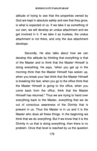 attitude of trying to see that the properties owned by God are kept in absolute safety and see that they grow, is what is expected of us. If we take it as something of our own, we will develop an undue attachment and we get involved in it. If we take it as trustees, the undue attachment is not there, and only the due attachment develops.