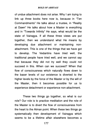 of undue attachment does not arise. Why I am trying to link up three books here now is, because in “Ten Commandments” He talks about a trustee, in “Reality at Dawn” He talks about how a Master is everything and in “Towards Infinity” He says, what would be the state of Vairagya. If all these three views are put together, then we understand what He means by developing due attachment or maintaining non- attachment. This is one of the things that we have got to develop. The Vedantins have tried well, the traditional people have tried well, and we cannot say that because they did not try well they could not succeed in this. When can we succeed? When that flow of consciousness which naturally flows down to the baser levels of our existence is diverted to the higher levels by the force of the Master or by the will of the Master, then it becomes possible for us to experience detachment or experience non-attachment.