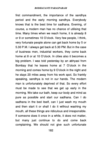 first commandment, the importance of the sandhya period and the early morning sandhya. Everybody knows that is the best time for sadhana. Evening, of course, a modern man has no chance of utilising that time. Many times when we reach home, it is already 8 or 9 or sometimes 10 O’clock. Very few people, I think, very fortunate people alone can get back home by 5 or 5.30 P.M. I always get back at 5.30 PM. But in the case of business men, industrial workers, they come back home at 8 or at 10 O’clock. In cities also it becomes a big problem. I was told yesterday by an abhyasi from Bombay that he leaves home at 7 O’clock in the morning and comes home by 9 O’clock in the night and he stays 20 miles away from his work spot. So frankly speaking, sandhya is not in our hands. The modern man is unfortunately deprived of that. So every effort must be made to see that we get up early in the morning. We take our bath, keep our body and mind as pure as possible and start our sadhana. Can I do sadhana in the bed itself, can I just wash my mouth and then start it or shall I do it without washing my mouth, all these things are ridiculous and irresponsible. If someone does it once in a while, it does not matter, but many just continue to do and come back complaining. We should not give such unfortunate