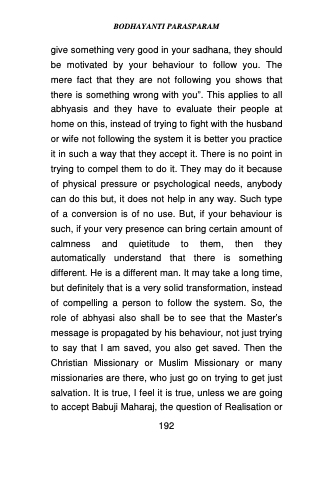give something very good in your sadhana, they should be motivated by your behaviour to follow you. The mere fact that they are not following you shows that there is something wrong with you”. This applies to all abhyasis and they have to evaluate their people at home on this, instead of trying to fight with the husband or wife not following the system it is better you practice it in such a way that they accept it. There is no point in trying to compel them to do it. They may do it because of physical pressure or psychological needs, anybody can do this but, it does not help in any way. Such type of a conversion is of no use. But, if your behaviour is such, if your very presence can bring certain amount of calmness and quietitude to them, then they automatically understand that there is something different. He is a different man. It may take a long time, but definitely that is a very solid transformation, instead of compelling a person to follow the system. So, the role of abhyasi also shall be to see that the Master’s message is propagated by his behaviour, not just trying to say that I am saved, you also get saved. Then the Christian Missionary or Muslim Missionary or many missionaries are there, who just go on trying to get just salvation. It is true, I feel it is true, unless we are going to accept Babuji Maharaj, the question of Realisation or