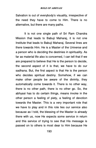 It is not one single path of Sri Ram Chandra Mission that leads to Babuji Maharaj, it is not one Institute that leads to Babuji Maharaj. Several lines are there towards Him. He is a Master of the Universe and a person who is deciding the destinies in spirituality. As far as material life also is concerned, I can tell that if we are prepared to believe that He is the person to decide, the second aspect of it is that, we have to do our sadhana. But, the first aspect is that He is the person who decides spiritual destiny. Somehow, if we can make other people be aware of the divinity, they automatically come towards it. There is no other way, there is no other path, there is no other go. So, the abhyasi has to do certain things, means invoke in the other person a feeling of piety, a feeling of devotion towards the Master. This is a very important role that we have to play and in this role lies our service also because as I told, the blessing of the Master is already there with us, now He expects some service in return and this service of trying to see that His message is passed on to others is most dear to Him because He