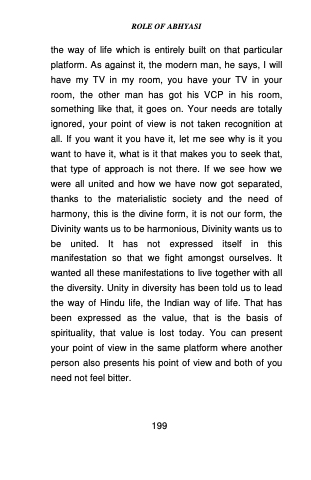 the way of life which is entirely built on that particular platform. As against it, the modern man, he says, I will have my TV in my room, you have your TV in your room, the other man has got his VCP in his room, something like that, it goes on. Your needs are totally ignored, your point of view is not taken recognition at all. If you want it you have it, let me see why is it you want to have it, what is it that makes you to seek that, that type of approach is not there. If we see how we were all united and how we have now got separated, thanks to the materialistic society and the need of harmony, this is the divine form, it is not our form, the Divinity wants us to be harmonious, Divinity wants us to be united. It has not expressed itself in this manifestation so that we fight amongst ourselves. It wanted all these manifestations to live together with all the diversity. Unity in diversity has been told us to lead the way of Hindu life, the Indian way of life. That has been expressed as the value, that is the basis of spirituality, that value is lost today. You can present your point of view in the same platform where another person also presents his point of view and both of you need not feel bitter.
