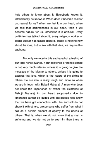 Not only we require this sadhana but a feeling of our total nonrelevance. Your existence or nonexistence is not very much relevant unless it is going to give the message of the Master to others, unless it is going to express that love, which is the nature of the divine to others. So our role is really tough and more so when we are in touch with Babuji Maharaj. A man who does not know the importance or rather the existence of Babuji Maharaj in our heart supposedly due to ignorance cannot be faulted with. But people who know that we have got connection with Him and still do not share it with others, are persons who suffer from what I call as a certain amount of apathy to the needs of others. That is, when we do not know that a man is suffering and we do not go to see him then there is