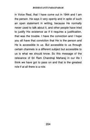 in Voice Real, that I have come out in 1944 and I am the person. He says it very openly and in spite of such an open statement in writing, because He normally never used to talk about it, and other people have tried to justify His existence as if it requires a justification, that was the trouble. I have the conviction and I hope you all have that conviction that He is the person and He is accessible to us. But accessible to us through certain channels is a different subject but accessible to us is what we should know. So this message of the relevance of Sri Ram Chandraji Maharaj in our life I think we have got to pass on and that is the greatest role if at all there is a role.