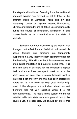 this stage is all sadhana. Deviating from the traditional approach Master has advised us not to take up the different steps of Ashtanga Yoga one by one separately. Under our system Asana, Pranayama, Dhyana and Samadhi are all taken up simultaneously during the course of meditation. Meditation in due course leads us to concentration or the state of samadhi.
