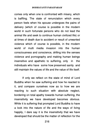 comes only when one is confronted with misery, which is baffling. The state of renunciation which every person feels when his spouse undergoes the pains of delivery (which of course is possible in the modern world in such fortunate persons who do not lead the animal life and seek to continue human civilized life) or at times of death due to accident or result of unwanted violence which of course is possible, in the modern world of multi media invasion into the human consciousness and conscience, drilling into the senses violence and pornography and making human beings insensitive and apathetic to suffering, only in the individuals who have some how preserved sanity and still maintain the values of life and the value of life itself.