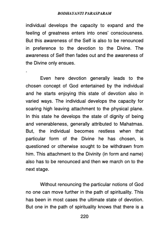 individual develops the capacity to expand and the feeling of greatness enters into ones’ consciousness. But this awareness of the Self is also to be renounced in preference to the devotion to the Divine. The awareness of Self then fades out and the awareness of the Divine only ensues.