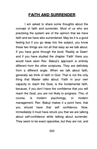 I am asked to share some thoughts about the concept of faith and surrender. Most of us who are practising the system are of the opinion that we have faith and we have also surrendered. May be it is a good feeling but if you go deep into the subject, you know these two things are not all that easy as we talk about. If you have gone through the book ‘Reality at Dawn’ and if you have studied the chapter ‘Faith’ there you would have seen Rev. Babuji’s approach is entirely different from the other scriptures. They are definitely from a different angle. When we talk about faith, generally we think of faith in God. That is not the only thing that Master talks about. Faith in your own capacity to reach the Goal, is the fundamental faith, because, if you don’t have the confidence that you will reach the Goal, you are not likely to progress. This, of course, is modern psychology, or modern management. Rev. Babuji makes it a point here, that you should have that self confidence. Now, immediately it must have struck you that we are talking about self-confidence while talking about surrender. They seem to be exact opposites, but they are not, and