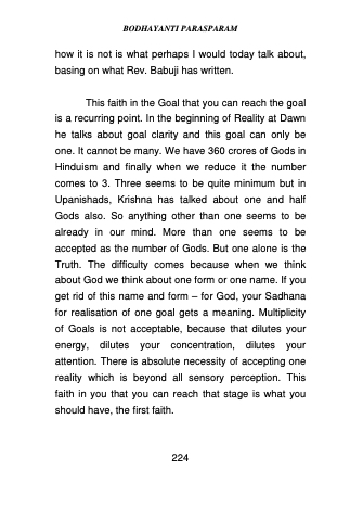This faith in the Goal that you can reach the goal is a recurring point. In the beginning of Reality at Dawn he talks about goal clarity and this goal can only be one. It cannot be many. We have 360 crores of Gods in Hinduism and finally when we reduce it the number comes to 3. Three seems to be quite minimum but in Upanishads, Krishna has talked about one and half Gods also. So anything other than one seems to be already in our mind. More than one seems to be accepted as the number of Gods. But one alone is the Truth. The difficulty comes because when we think about God we think about one form or one name. If you get rid of this name and form – for God, your Sadhana for realisation of one goal gets a meaning. Multiplicity of Goals is not acceptable, because that dilutes your energy, dilutes your concentration, dilutes your attention. There is absolute necessity of accepting one reality which is beyond all sensory perception. This faith in you that you can reach that stage is what you should have, the first faith.