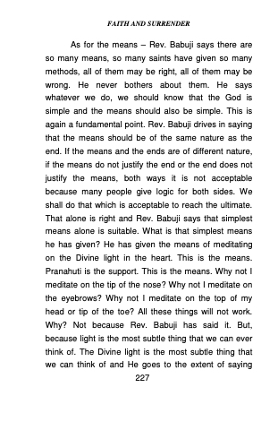 As for the means – Rev. Babuji says there are so many means, so many saints have given so many methods, all of them may be right, all of them may be wrong. He never bothers about them. He says whatever we do, we should know that the God is simple and the means should also be simple. This is again a fundamental point. Rev. Babuji drives in saying that the means should be of the same nature as the end. If the means and the ends are of different nature, if the means do not justify the end or the end does not justify the means, both ways it is not acceptable because many people give logic for both sides. We shall do that which is acceptable to reach the ultimate. That alone is right and Rev. Babuji says that simplest means alone is suitable. What is that simplest means he has given? He has given the means of meditating on the Divine light in the heart. This is the means. Pranahuti is the support. This is the means. Why not I meditate on the tip of the nose? Why not I meditate on the eyebrows? Why not I meditate on the top of my head or tip of the toe? All these things will not work. Why? Not because Rev. Babuji has said it. But, because light is the most subtle thing that we can ever think of. The Divine light is the most subtle thing that we can think of and He goes to the extent of saying