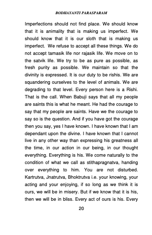Imperfections should not find place. We should know that it is animality that is making us imperfect. We should know that it is our sloth that is making us imperfect. We refuse to accept all these things. We do not accept tamasik life nor rajasik life. We move on to the satvik life. We try to be as pure as possible, as fresh purity as possible. We maintain so that the divinity is expressed. It is our duty to be rishis. We are squandering ourselves to the level of animals. We are degrading to that level. Every person here is a Rishi. That is the call. When Babuji says that all my people are saints this is what he meant. He had the courage to say that my people are saints. Have we the courage to say so is the question. And if you have got the courage then you say, yes I have known. I have known that I am dependant upon the divine. I have known that I cannot live in any other way than expressing his greatness all the time, in our action in our being, in our thought everything. Everything is his. We come naturally to the condition of what we call as stithapragnatva, handing over everything to him. You are not disturbed. Kartrutva, Jnatrutva, Bhoktrutva i.e. your knowing, your acting and your enjoying, if so long as we think it is ours, we will be in misery. But if we know that it is his, then we will be in bliss. Every act of ours is his. Every