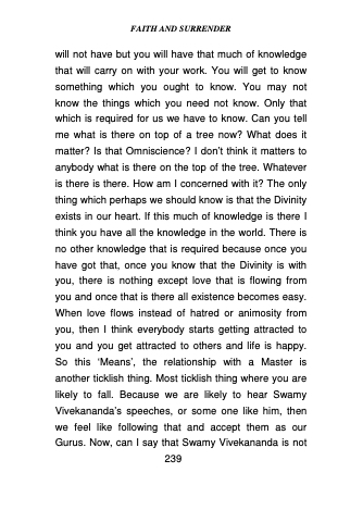 will not have but you will have that much of knowledge that will carry on with your work. You will get to know something which you ought to know. You may not know the things which you need not know. Only that which is required for us we have to know. Can you tell me what is there on top of a tree now? What does it matter? Is that Omniscience? I don’t think it matters to anybody what is there on the top of the tree. Whatever is there is there. How am I concerned with it? The only thing which perhaps we should know is that the Divinity exists in our heart. If this much of knowledge is there I think you have all the knowledge in the world. There is no other knowledge that is required because once you have got that, once you know that the Divinity is with you, there is nothing except love that is flowing from you and once that is there all existence becomes easy. When love flows instead of hatred or animosity from you, then I think everybody starts getting attracted to you and you get attracted to others and life is happy. So this ‘Means’, the relationship with a Master is another ticklish thing. Most ticklish thing where you are likely to fall. Because we are likely to hear Swamy Vivekananda’s speeches, or some one like him, then we feel like following that and accept them as our Gurus. Now, can I say that Swamy Vivekananda is not