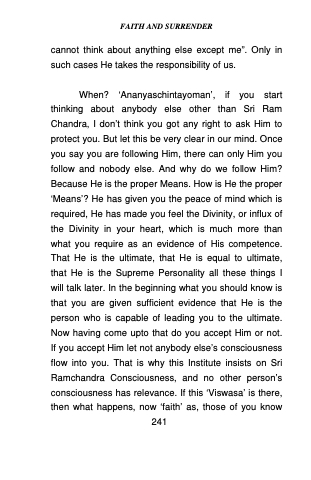 When? ‘Ananyaschintayoman’, if you start thinking about anybody else other than Sri Ram Chandra, I don’t think you got any right to ask Him to protect you. But let this be very clear in our mind. Once you say you are following Him, there can only Him you follow and nobody else. And why do we follow Him? Because He is the proper Means. How is He the proper ‘Means’? He has given you the peace of mind which is required, He has made you feel the Divinity, or influx of the Divinity in your heart, which is much more than what you require as an evidence of His competence. That He is the ultimate, that He is equal to ultimate, that He is the Supreme Personality all these things I will talk later. In the beginning what you should know is that you are given sufficient evidence that He is the person who is capable of leading you to the ultimate. Now having come upto that do you accept Him or not. If you accept Him let not anybody else’s consciousness flow into you. That is why this Institute insists on Sri Ramchandra Consciousness, and no other person’s consciousness has relevance. If this ‘Viswasa’ is there, then what happens, now ‘faith’ as, those of you know