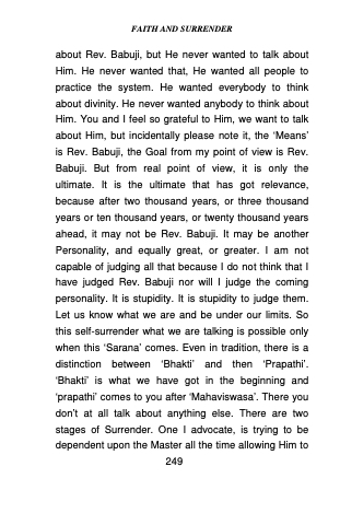 about Rev. Babuji, but He never wanted to talk about Him. He never wanted that, He wanted all people to practice the system. He wanted everybody to think about divinity. He never wanted anybody to think about Him. You and I feel so grateful to Him, we want to talk about Him, but incidentally please note it, the ‘Means’ is Rev. Babuji, the Goal from my point of view is Rev. Babuji. But from real point of view, it is only the ultimate. It is the ultimate that has got relevance, because after two thousand years, or three thousand years or ten thousand years, or twenty thousand years ahead, it may not be Rev. Babuji. It may be another Personality, and equally great, or greater. I am not capable of judging all that because I do not think that I have judged Rev. Babuji nor will I judge the coming personality. It is stupidity. It is stupidity to judge them. Let us know what we are and be under our limits. So this self-surrender what we are talking is possible only when this ‘Sarana’ comes. Even in tradition, there is a distinction between ‘Bhakti’ and then ‘Prapathi’. ‘Bhakti’ is what we have got in the beginning and ‘prapathi’ comes to you after ‘Mahaviswasa’. There you don’t at all talk about anything else. There are two stages of Surrender. One I advocate, is trying to be dependent upon the Master all the time allowing Him to