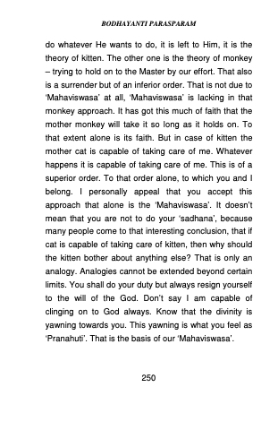 do whatever He wants to do, it is left to Him, it is the theory of kitten. The other one is the theory of monkey – trying to hold on to the Master by our effort. That also is a surrender but of an inferior order. That is not due to ‘Mahaviswasa’ at all, ‘Mahaviswasa’ is lacking in that monkey approach. It has got this much of faith that the mother monkey will take it so long as it holds on. To that extent alone is its faith. But in case of kitten the mother cat is capable of taking care of me. Whatever happens it is capable of taking care of me. This is of a superior order. To that order alone, to which you and I belong. I personally appeal that you accept this approach that alone is the ‘Mahaviswasa’. It doesn’t mean that you are not to do your ‘sadhana’, because many people come to that interesting conclusion, that if cat is capable of taking care of kitten, then why should the kitten bother about anything else? That is only an analogy. Analogies cannot be extended beyond certain limits. You shall do your duty but always resign yourself to the will of the God. Don’t say I am capable of clinging on to God always. Know that the divinity is yawning towards you. This yawning is what you feel as ‘Pranahuti’. That is the basis of our ‘Mahaviswasa’.