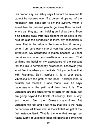 this proper way, as Babuji says it cannot be severed. It cannot be severed even if a person drops out of the meditation and does not follow the system. When I asked him that several people go away then he said, where can they go. I am holding on. I allow them. Even if he passes away from this present life he says in the next life also the connection is there. My connection is there. That is the value of the introduction, if properly done. I am sure every one of you has been properly introduced. My assurance is mainly because you feel the vibrations when you meditate on your own. That confirms my belief or my acceptance of the concept that the link is permanently established. Otherwise you won’t feel that when you meditate. But you confuse that with Pranahuti. Don’t confuse it. It is your state. Vibrations are the path of the nada. Nadhopasana is actually our method. If one reads Lalaji he says nadopasana is the path and then here it is. The vibrations are the finest forms of song or the nada, we are going beyond the levels of sensory. That is why you won’t feel the Omkara many times. But vibrations we feel and if we know that this is the nada perhaps we will know what is the link that we get at the first instance itself. That is the one that we get as Ajapa. Many of us ignore these vibrations as something