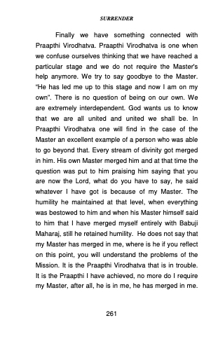 Finally we have something connected with Praapthi Virodhatva. Praapthi Virodhatva is one when we confuse ourselves thinking that we have reached a particular stage and we do not require the Master's help anymore. We try to say goodbye to the Master. “He has led me up to this stage and now I am on my own”. There is no question of being on our own. We are extremely interdependent. God wants us to know that we are all united and united we shall be. In Praapthi Virodhatva one will find in the case of the Master an excellent example of a person who was able to go beyond that. Every stream of divinity got merged in him. His own Master merged him and at that time the question was put to him praising him saying that you are now the Lord, what do you have to say, he said whatever I have got is because of my Master. The humility he maintained at that level, when everything was bestowed to him and when his Master himself said to him that I have merged myself entirely with Babuji Maharaj, still he retained humility. He does not say that my Master has merged in me, where is he if you reflect on this point, you will understand the problems of the Mission. It is the Praapthi Virodhatva that is in trouble. It is the Praapthi I have achieved, no more do I require my Master, after all, he is in me, he has merged in me.