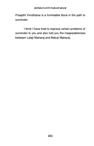 BODHAYANTI PARASPARAM Praapthi Virodhatva is a formidable block in the path to surrender. I think I have tried to express certain problems of surrender to you and also told you the inseparableness between Lalaji Maharaj and Babuji Maharaj. 262