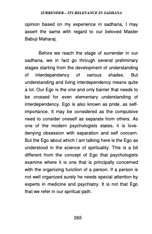 Before we reach the stage of surrender in our sadhana, we in fact go through several preliminary stages starting from the development of understanding of interdependency of various shades. But understanding and living interdependency means quite a lot. Our Ego is the one and only barrier that needs to be crossed for even elementary understanding of interdependency. Ego is also known as pride, as self- importance. It may be considered as the compulsive need to consider oneself as separate from others. As one of the modern psychologists states, it is love- denying obsession with separation and self concern. But the Ego about which I am talking here is the Ego as understood in the science of spirituality. This is a bit different from the concept of Ego that psychologists examine where it is one that is principally concerned with the organizing function of a person. If a person is not well organized surely he needs special attention by experts in medicine and psychiatry. It is not that Ego that we refer in our spiritual path.
