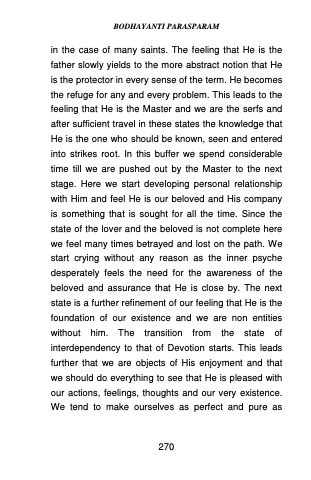 in the case of many saints. The feeling that He is the father slowly yields to the more abstract notion that He is the protector in every sense of the term. He becomes the refuge for any and every problem. This leads to the feeling that He is the Master and we are the serfs and after sufficient travel in these states the knowledge that He is the one who should be known, seen and entered into strikes root. In this buffer we spend considerable time till we are pushed out by the Master to the next stage. Here we start developing personal relationship with Him and feel He is our beloved and His company is something that is sought for all the time. Since the state of the lover and the beloved is not complete here we feel many times betrayed and lost on the path. We start crying without any reason as the inner psyche desperately feels the need for the awareness of the beloved and assurance that He is close by. The next state is a further refinement of our feeling that He is the foundation of our existence and we are non entities without him. The transition from the state of interdependency to that of Devotion starts. This leads further that we are objects of His enjoyment and that we should do everything to see that He is pleased with our actions, feelings, thoughts and our very existence. We tend to make ourselves as perfect and pure as