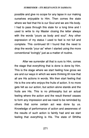 possible and give no scope for any lapse in our making ourselves enjoyable to Him. Then comes the state where we feel that He is our Soul and we are His body. I had to pass through this state for a long time and I used to write to my Master closing the letter always with the words “yours as body and soul”. Any other expression of my status I used to feel is not full and complete. This continued till I found that the need to drop the words “your as” when I started using the more conventional ‘lovingly” just as a matter of routine.