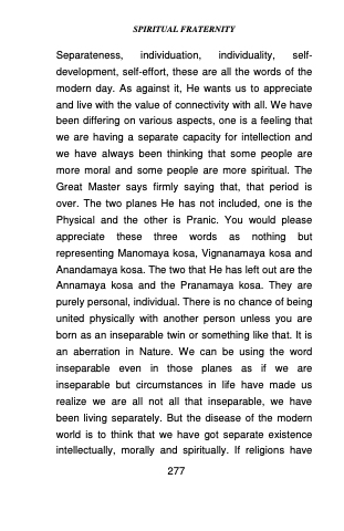 Separateness, individuation, individuality, self- development, self-effort, these are all the words of the modern day. As against it, He wants us to appreciate and live with the value of connectivity with all. We have been differing on various aspects, one is a feeling that we are having a separate capacity for intellection and we have always been thinking that some people are more moral and some people are more spiritual. The Great Master says firmly saying that, that period is over. The two planes He has not included, one is the Physical and the other is Pranic. You would please appreciate these three words as nothing but representing Manomaya kosa, Vignanamaya kosa and Anandamaya kosa. The two that He has left out are the Annamaya kosa and the Pranamaya kosa. They are purely personal, individual. There is no chance of being united physically with another person unless you are born as an inseparable twin or something like that. It is an aberration in Nature. We can be using the word inseparable even in those planes as if we are inseparable but circumstances in life have made us realize we are all not all that inseparable, we have been living separately. But the disease of the modern world is to think that we have got separate existence intellectually, morally and spiritually. If religions have