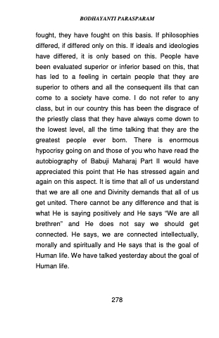 fought, they have fought on this basis. If philosophies differed, if differed only on this. If ideals and ideologies have differed, it is only based on this. People have been evaluated superior or inferior based on this, that has led to a feeling in certain people that they are superior to others and all the consequent ills that can come to a society have come. I do not refer to any class, but in our country this has been the disgrace of the priestly class that they have always come down to the lowest level, all the time talking that they are the greatest people ever born. There is enormous hypocrisy going on and those of you who have read the autobiography of Babuji Maharaj Part II would have appreciated this point that He has stressed again and again on this aspect. It is time that all of us understand that we are all one and Divinity demands that all of us get united. There cannot be any difference and that is what He is saying positively and He says “We are all brethren” and He does not say we should get connected. He says, we are connected intellectually, morally and spiritually and He says that is the goal of Human life. We have talked yesterday about the goal of Human life.