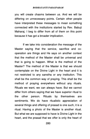 you will create chasms between us. And we will be differing on unnecessary points. Certain other people have interpreted these messages to mean something connected with the institutions started by Rev. Babuji Maharaj. I beg to differ from all of them on this point because it has got a broader implication.