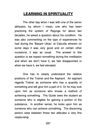 The other day when I was with one of the senior abhyasis, by whom I mean, one who has been practicing the system of Rajyoga for about two decades, he asked a question about his condition. He was also commenting on the type of experiences he had during the ‘Basant Utsav’ at Calcutta wherein on some days it was very good and on certain other occasions, it was as usual. The answer to this question is we expect something during the meditation and when we don’t have it, we feel disappointed or when we have it, we feel elevated.