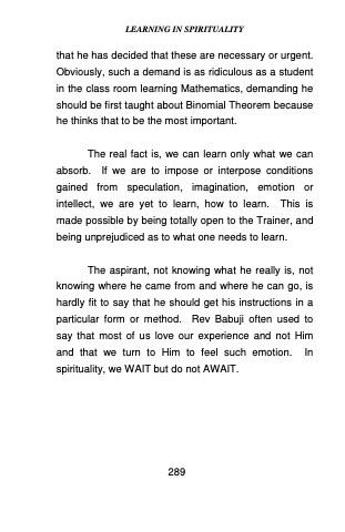 The aspirant, not knowing what he really is, not knowing where he came from and where he can go, is hardly fit to say that he should get his instructions in a particular form or method. Rev Babuji often used to say that most of us love our experience and not Him and that we turn to Him to feel such emotion. In spirituality, we WAIT but do not AWAIT.