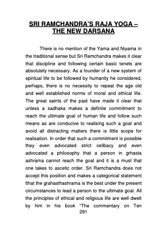 There is no mention of the Yama and Niyama in the traditional sense but Sri Ramchandra makes it clear that discipline and following certain basic tenets are absolutely necessary. As a founder of a new system of spiritual life to be followed by humanity he considered, perhaps, there is no necessity to repeat the age old and well established norms of moral and ethical life. The great saints of the past have made it clear that unless a sadhaka makes a definite commitment to reach the ultimate goal of human life and follow such means as are conducive to realising such a goal and avoid all distracting matters there is little scope for realisation. In order that such a commitment is possible they even advocated strict celibacy and even advocated a philosophy that a person in grhasta ashrama cannot reach the goal and it is a must that one takes to ascetic order. Sri Ramchandra does not accept this position and makes a categorical statement lthat the grahasthashrama is the best under the present circumstances to lead a person to the ultimate goal. All the principles of ethical and religious life are well dwelt