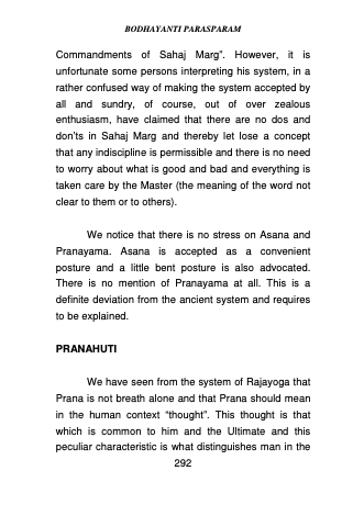 We notice that there is no stress on Asana and Pranayama. Asana is accepted as a convenient posture and a little bent posture is also advocated. There is no mention of Pranayama at all. This is a definite deviation from the ancient system and requires to be explained.