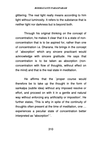 He affirms that the `proper course would therefore be to take up the thought in the form of sankalpa (subtle idea) without any imposed resolve or effort, and proceed on with it in a gentle and natural way without enforcing any artificiality or imposition’. He further states, ‘This is why in spite of the continuity of thoughts often present at the time of meditation, one ... experiences a peculiar state of concentration better interpreted as “absorption” ’.
